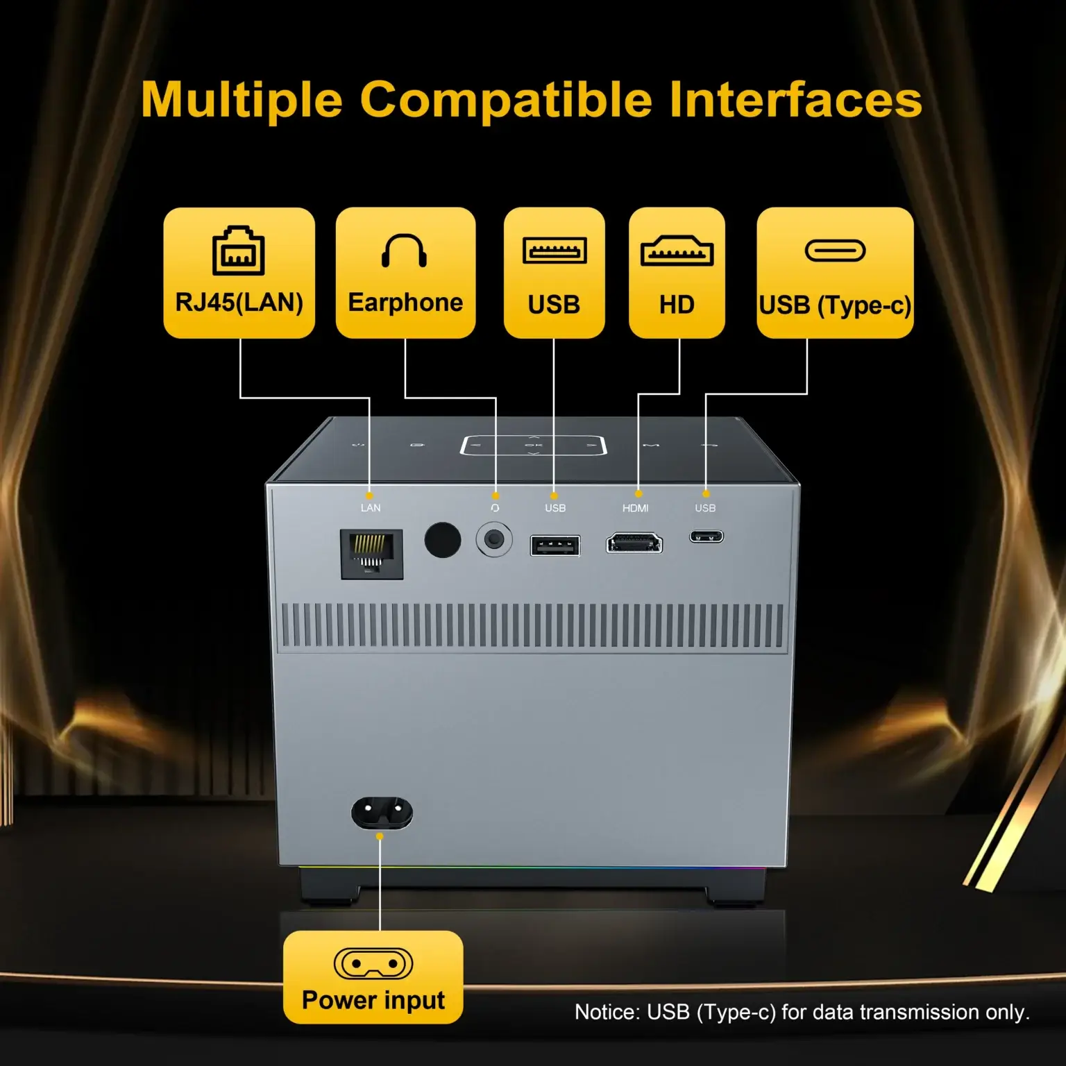 Full HD 1080P resolution with electric focus, RGB colorful lighting, dual WiFi, and Bluetooth 5.0. A powerful and portable projector ideal for home theater, gaming, and office use.